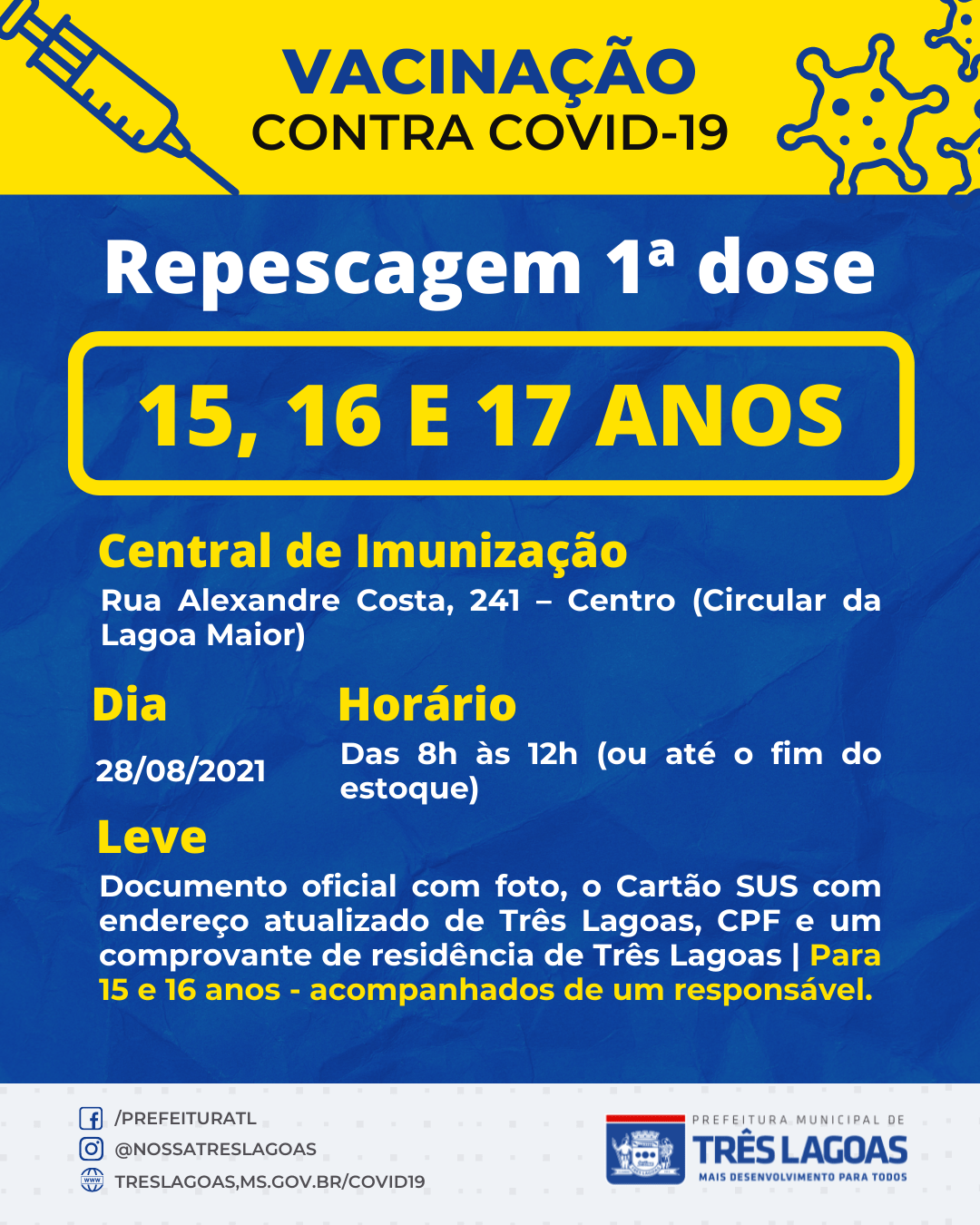 Aqueles que têm 15 e 16 anos de idades, devem ir ao local acompanhados de um responsável maior de idade (+ de 18 anos) e todos (15, 16 e 17 anos), devem levar um documento oficial com foto, o Cartão SUS com endereço atualizado de Três Lagoas (atualiza nas Unidades de Saúde), CPF e um comprovante de residência mais recente em seu nome ou, se não tiver, uma declaração de moradia do responsável da casa onde mora.