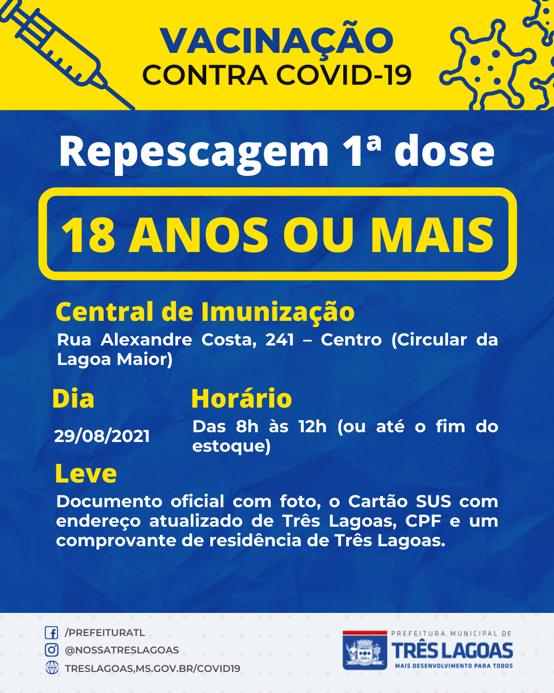 Aqueles que vão receber a 1ª dose nesse dia, devem estar munidos de documento oficial com foto, o Cartão SUS com endereço atualizado de Três Lagoas (atualiza nas Unidades de Saúde), CPF e um comprovante de residência recente em seu nome ou, se não tiver, uma declaração de moradia do responsável da casa onde mora.