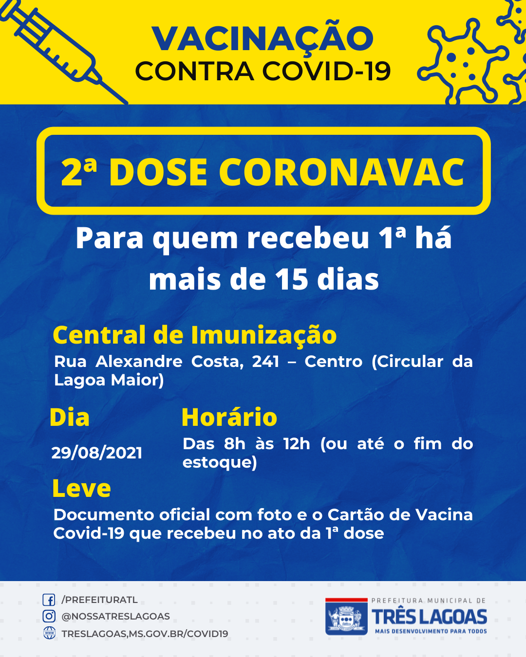 No dia 28 de agosto de 2021, das 8h às 12h (ou enquanto durar estoque) também na Central de Imunização que funciona no Prédio da Biblioteca Municipal que fica na Rua Alexandre Costa, 241 – Centro (Circular da Lagoa Maior), todos aqueles que têm mais de 18 anos podem receber a 1ª dose da vacina. Além disso, aqueles que receberam a 1ª dose de Coronavac há mais de 15 dias poderão se imunizar com a 2ª.