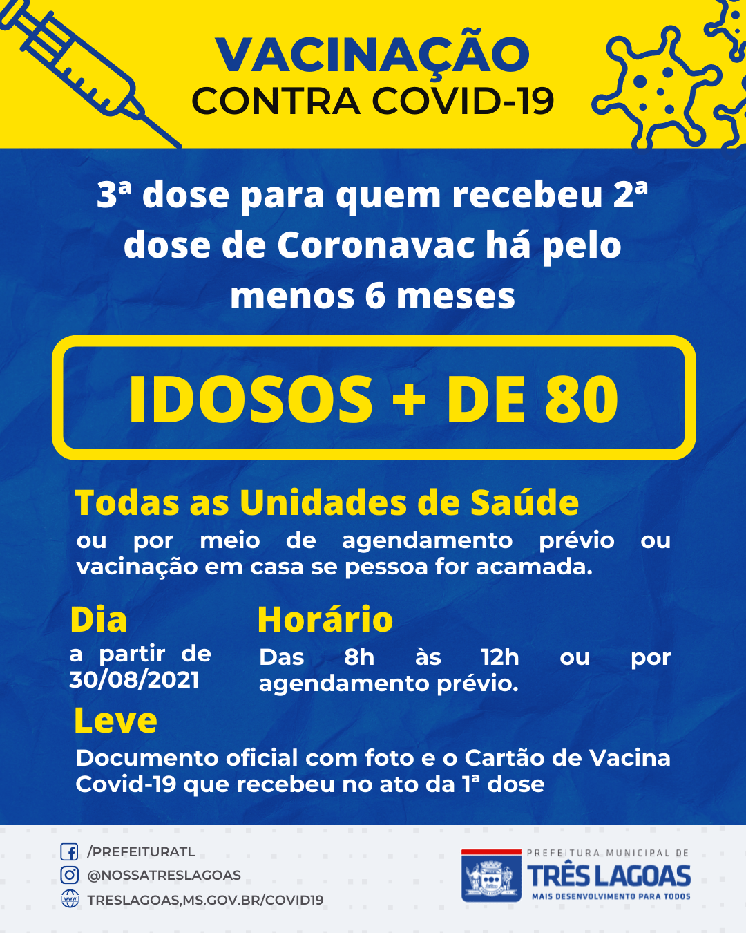 A Secretaria Municipal de Saúde (SMS) recebeu do Ministério da Saúde, por meio do Governo do Estado de Mato Grosso do Sul, mais 6.496 doses de vacina contra a Covid-19 e, com isso, além da Dose 1 e 2, anuncia o início da vacinação com Dose 3 para idosos acima de 80 anos de idade e para os institucionalizados que receberam a 2ª Dose de Coronavac há pelo menos 6 meses.