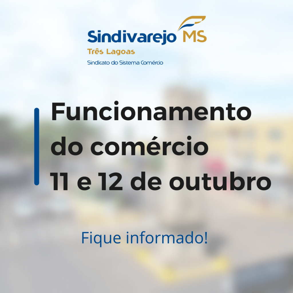 Sindicato dos Empregados no Comércio de Três Lagoas-MS e o Sindicato do Comércio Varejista de Três Lagoas-MS comunicam o acordo de funcionamento do comércio no feriado estadual de Divisão do Estado e feriado nacional Dia da Padroeira do Brasil (Nossa Senhora Aparecida) – Dia das Crianças: