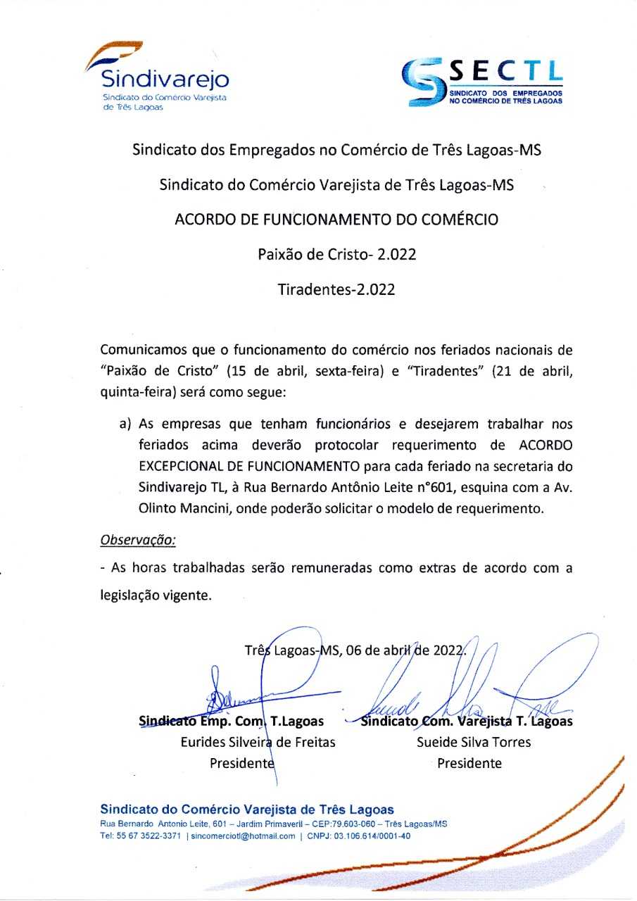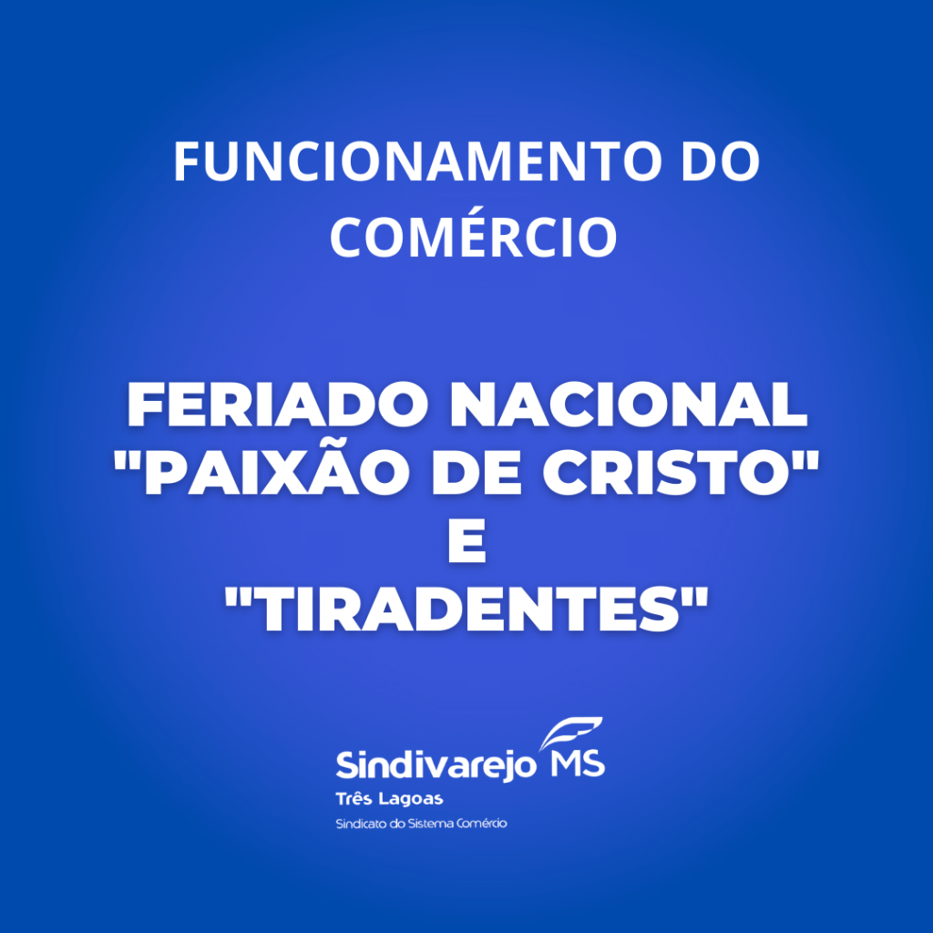 Comunicamos que o funcionamento do comércio nos feriados nacionais de “Paixão de Cristo” (15 de abril, sexta-feira) e “Tiradentes” (21 de abril, quinta-feira) será como segue: