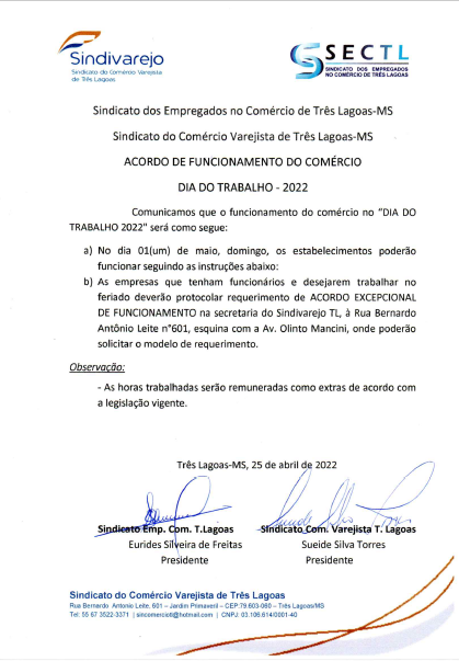 - As empresas que tenham funcionários e desejarem trabalhar no feriado deverão protocolar requerimento de ACORDO EXCEPCIONAL DE FUNCIONAMENTO na secretaria do Sindivarejo TL, à Rua Bernardo Antônio Leite n°601, esquina com a Av. Olinto Mancini, onde poderão solicitar o modelo de requerimento.