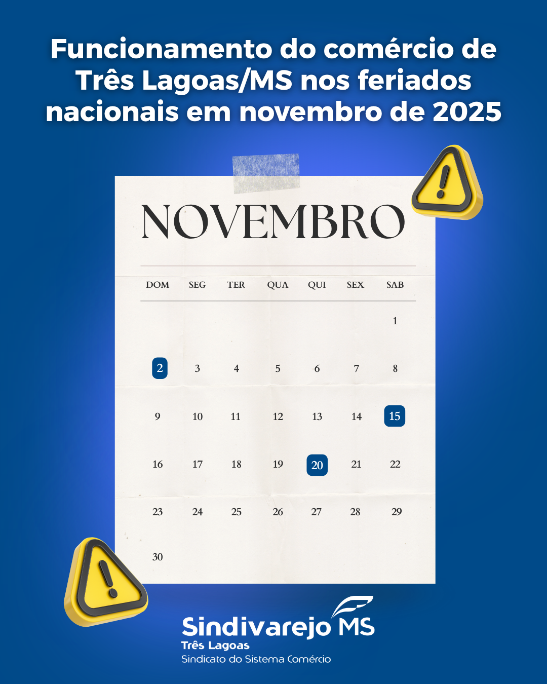 Comunicamos que o funcionamento do comércio do dia 02, 15 e 20 de novembro será como segue: Obs.: – As horas trabalhadas nos dias 02,
